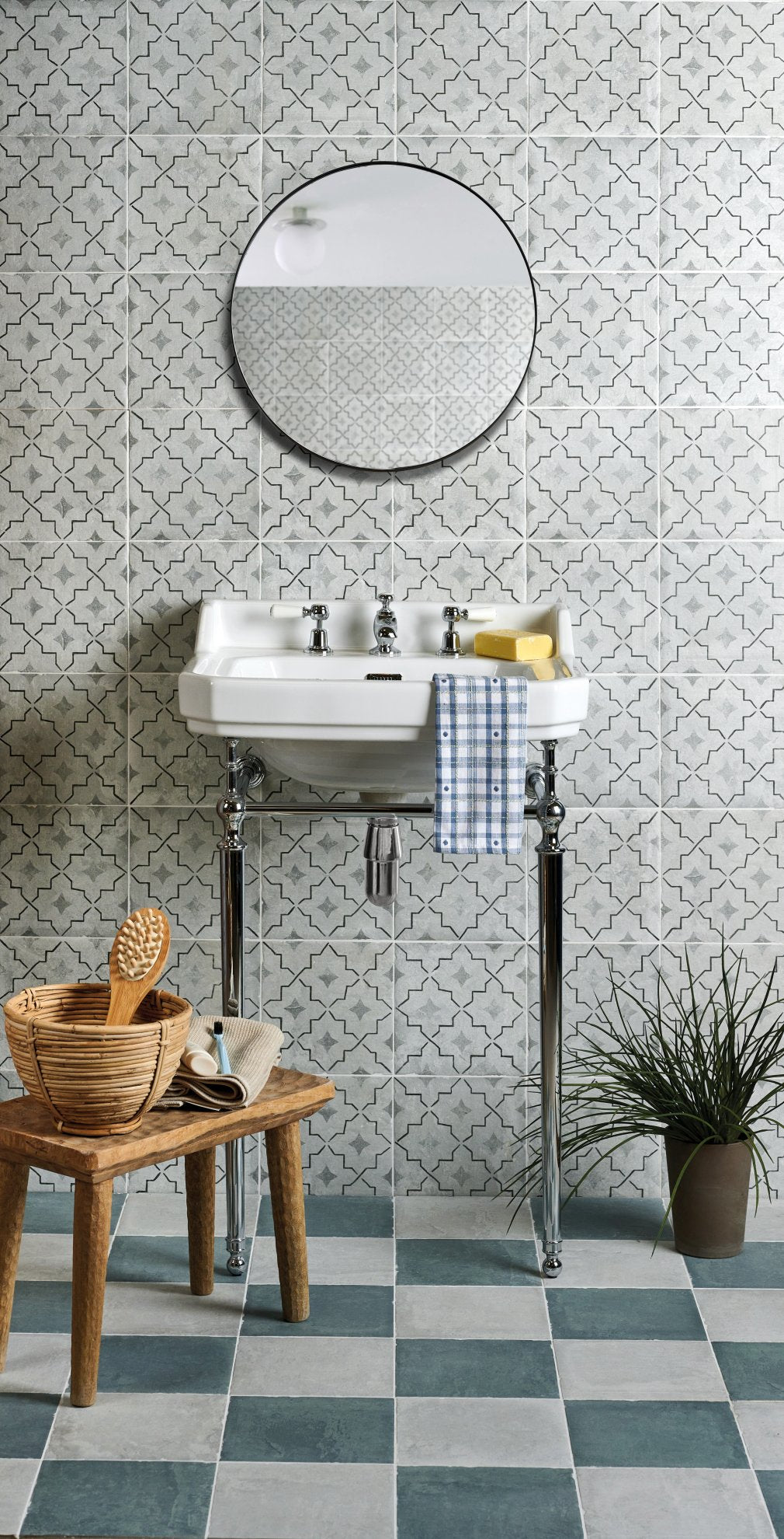 Porcelain tile in soft blue‑grey tones with a gently textured matt finish in a geometric style.
