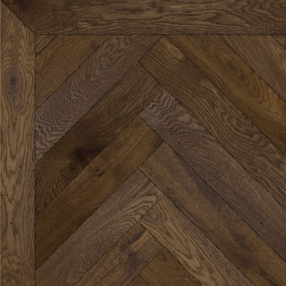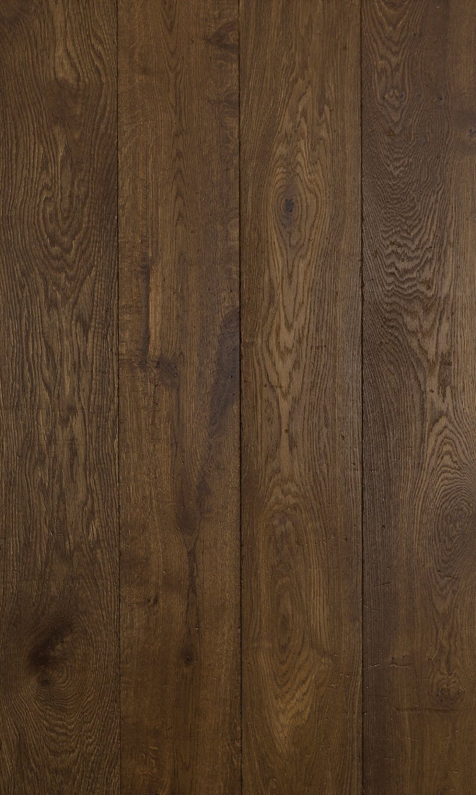 Tumbled dark‑smoked European engineered oak with softened edges and a deep tone.
